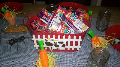 We all love Horizon Organic milk . . . and the cows on it just happen to go with her theme! I love the carrots sticking out of the little pots on the table. Look at the big ant on the table, too!