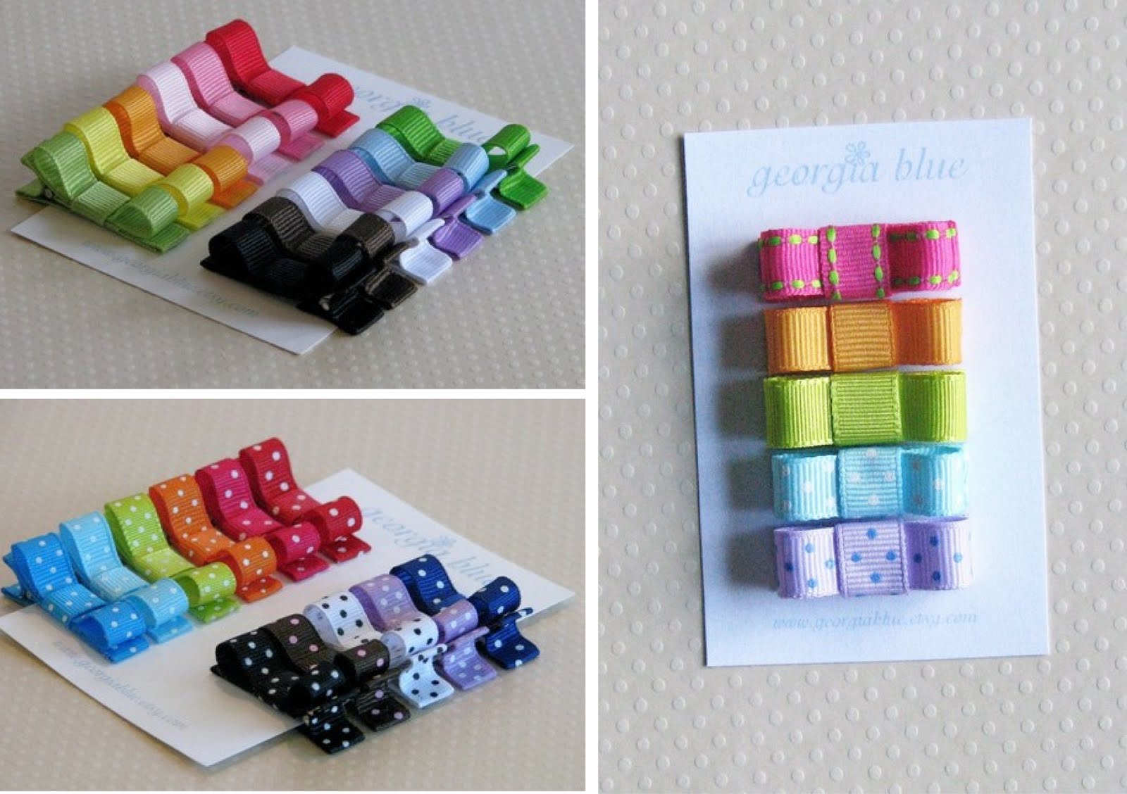 Heather, the owner of Georgia Blue, creates a variety of types of hair accessories. Bows, hair rosettes, headbands, clippies and hairpins… beautiful enough to make you want to buy one of each!