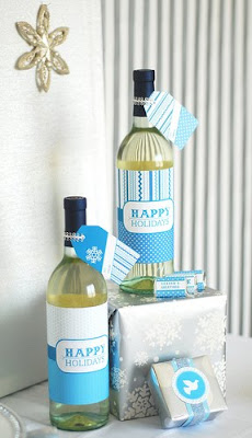 Wine bottles bottles wrapped with our printed favor tag/label were embellished with silver cording and logos from our collection.