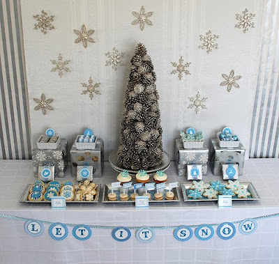 There is still a lot of time after the holidays to host an open house or throw a party and what better a theme than a winter wonderland! Anders Ruff Custom Designs has created The Printable Winter Wonderland Design Collection (which, by the way, is 50% off through December 15th). A focus on silvers, blues and whites makes this table feel elegant, festive and light. With silver being a very popular tone at this time of year, this collection is both versatile and something that will be in style for years to come. In addition to our Winter Wonderland design collection, we created free printables that coordinate with this collection (included are party logos, recipe cards and food tags).