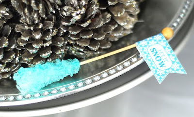 The focal point of the table is a glittered pine cone tree, to give off the look of a fresh snowfall.